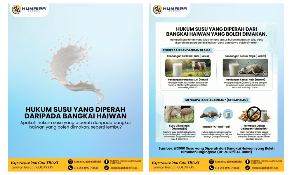 Namun, menurut infografik Humaira Global, terdapat perbezaan pendapat di antara ulama’ yang menyatakan bahawa hukum mengambil susu yang diperah daripada bangkai boleh dimakan adalah harus.