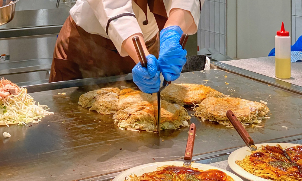 Okonomiyaki, lempeng Jepun yang dimasak di atas pemanggang besi secara langsung di hadapan para tetamu. (kredit foto: Facebook FOOD)