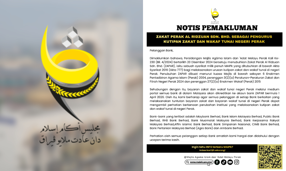 “Oleh itu, kami berharap agar semua pelanggan di setiap bank berkaitan yang melaksanakan tuntutan bayaran zakat dan bayaran wakaf tunai di negeri Perak dapat mengambil perhatian berkenaan perubahan institusi yang melaksanakan kutipan zakat dan wakaf tunai di negeri Perak,” katanya.