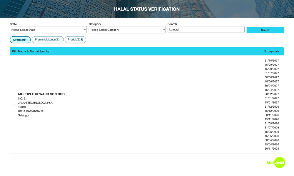 Kinihalal’s check through Halal Malaysia Portal determines that the bakery, wholly owned by Multiple Reward Sdn. Bhd, is halal-certified.